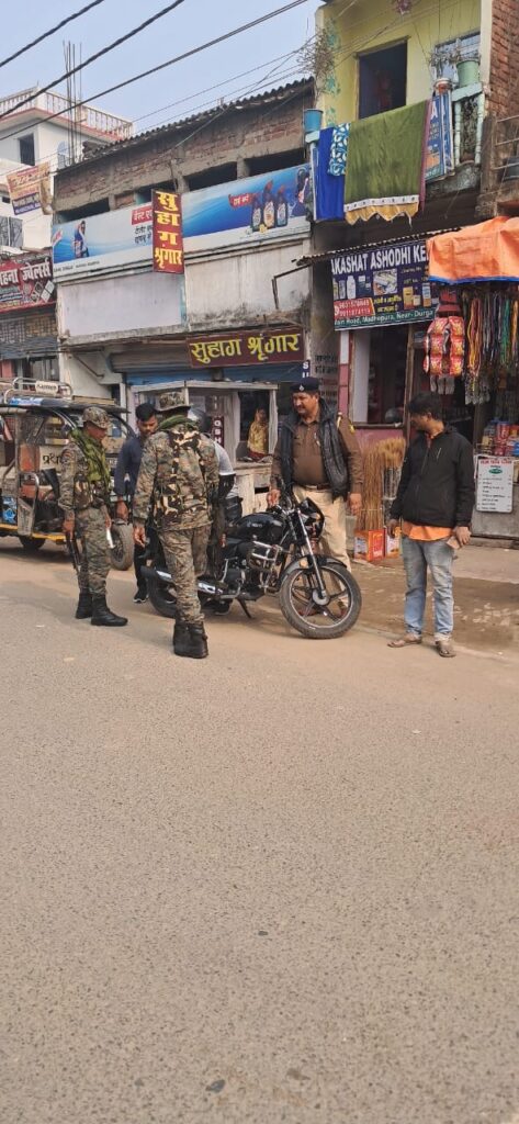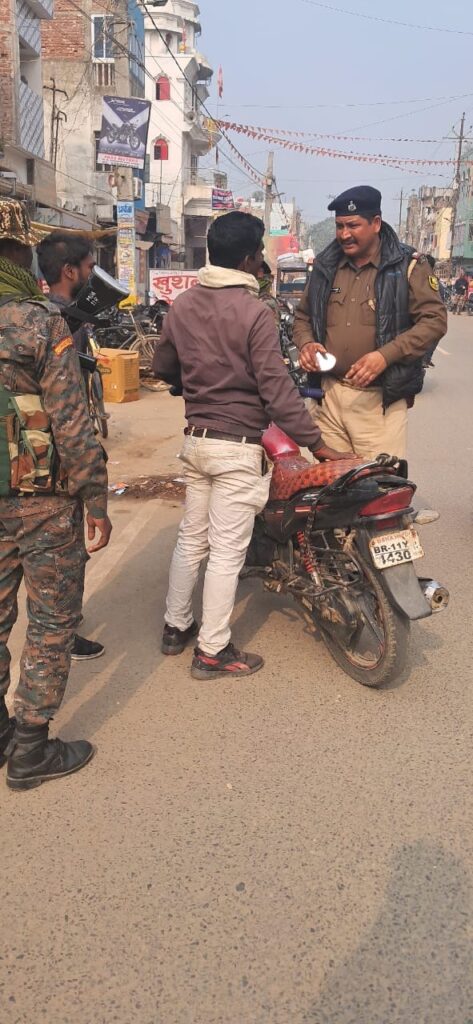 जिला मुख्यालय में इन दिनों शहर में लगातार लूट कांड व चोरी व नाबालिग वाहन चला रहे है. इसको लेकर पुलिस अधीक्षक संदीप सिंह के निर्देशानुसार दो पहिया वाहन का सघन वाहन चेकिंग अभियान चलाया जा रहा है. वही कॉलेज चौक, कर्पूरी चौक एवम अन्य सभी जगह पुलिस निरीक्षक इंद्रजीत तांती एवं उनकी टीम द्वारा सघन दो पहिया वाहन की बारीकी से जांच किया गया. गाड़ी का कागज, हेलमेट, अनुज्ञप्ति, डिक्की आदि की जांच की जा रही थी. जिसमे कई बाइक चालक बीना कागजात व बिना हेलमेट लिए गाड़ी चलाते हुए पकड़ा गया. सभी से 1000 रुपए सघन वाहन चेकिंग अभियान से बीना हेलमेट व बिना कागजात के गाड़ी चालकों में हड़कंप मचा हुआ है. वही बिना हेलमेट के 1000 रुपये जुर्माना वसूला गया. एवम बिना वाहन अनुज्ञप्ति , बीमा एवं ट्रिपल लोडिंग के वाहन को थाना में लाकर उसके अभिभावकों को समझाया गया.एवम चालान वसूल कर छोड़ दिया गया. वही थानाध्यक्ष विमलेंदु कुमार ने बताया कि एसपी संदीप सिंह के निर्देशानुसार संध्या पैदल गस्ती अभियान चलाया जा रहा है. जिसमें मोटरसाइकिल लहरिया कटिंग, ट्रिपल लोडिंग एवं असामाजिक तत्व के युवक को धरपकड़ जा रहा है.